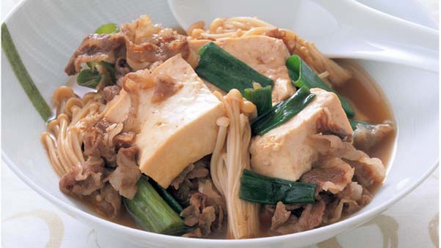 なべに【A】を入れて煮立て、1の牛肉を入れる。再び煮立ったら、アクを取り除き、2を加え、豆腐に火が通るまで弱めの中火で3~4分間煮る。