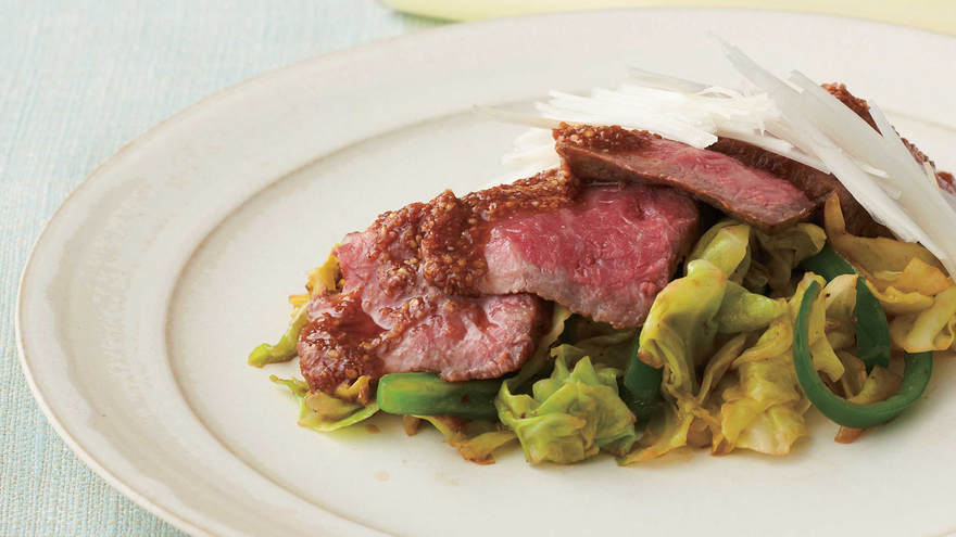 梅&ごまベースのソースが脂っこさをさっぱりと抑えます!野菜炒めの上に牛肉を盛るので、副菜なしでも一皿で満足できますよ。