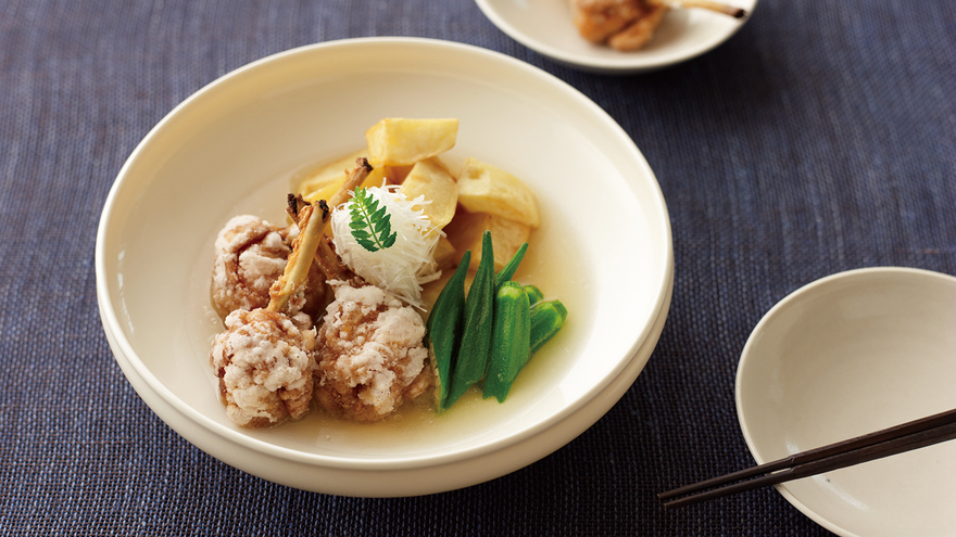 カラリと揚げた鶏肉に、揚げ煮にしたじゃがいもを合わせました。だしがさらに肉のおいしさを引き出して、から揚げがもてなし料理に昇格しますよ。