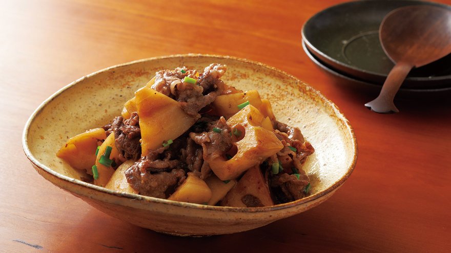シャキシャキのれんこんと柔らかい牛肉の食感の違いが楽しい一品です。