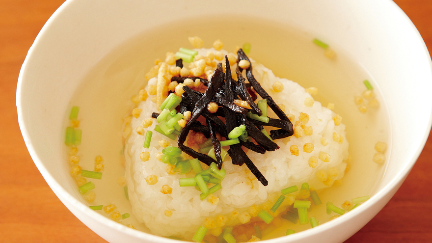 おにぎりを器に入れ、【B】の具をのせる。2に分量の熱湯を注ぎ、程よく香りと色が出たら器に注ぐ。