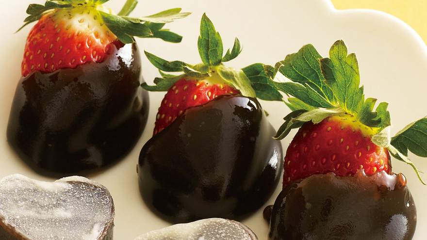2がアツアツのうちに、いちご1コのヘタを持ち、いちごの2/3くらいのところまで浸し、あんをよくからませる(やけどに注意)。バットに並べ、あんが固まるまで冷ます。残りも同様にする。