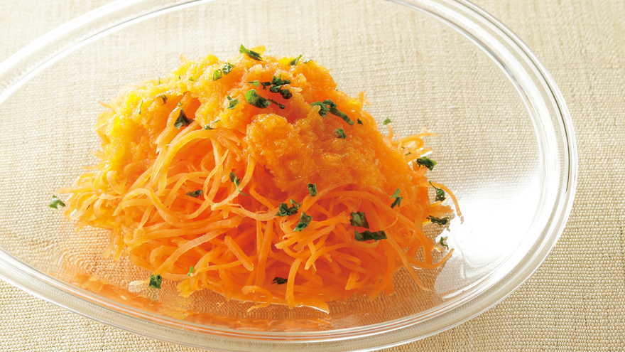 軽く塩もみしたシャキシャキの春にんじんを、すりおろした春にんじん入りのドレッシングで。シンプルですが、香りも彩りも華やかな一皿です。
