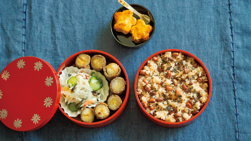 お赤飯とごぼうの牛肉巻きが主役のお弁当。少しよそいき感があり、見た目も華やかです。