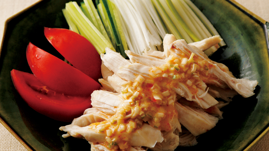 皿に3の野菜を並べ、6の肉を食べやすく裂いて盛り、【たれ】をかける。好みでラーユをかけてもよい。