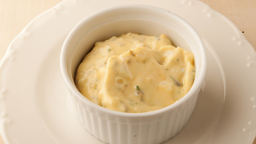 自家製マヨネーズには、シェリービネガーを使います。熟成された香りとキレのある酸味で、パンチのあるタルタルソースに。