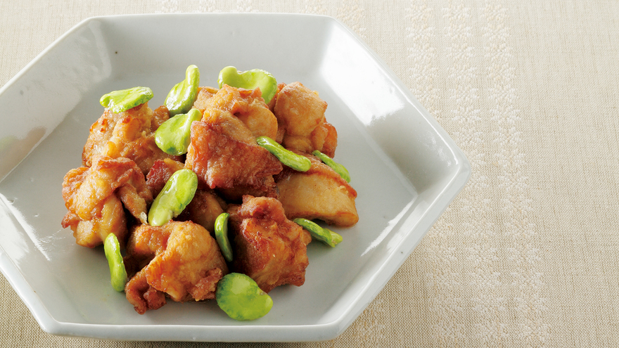 揚げたてを器に盛り、そら豆を盛り合わせる。