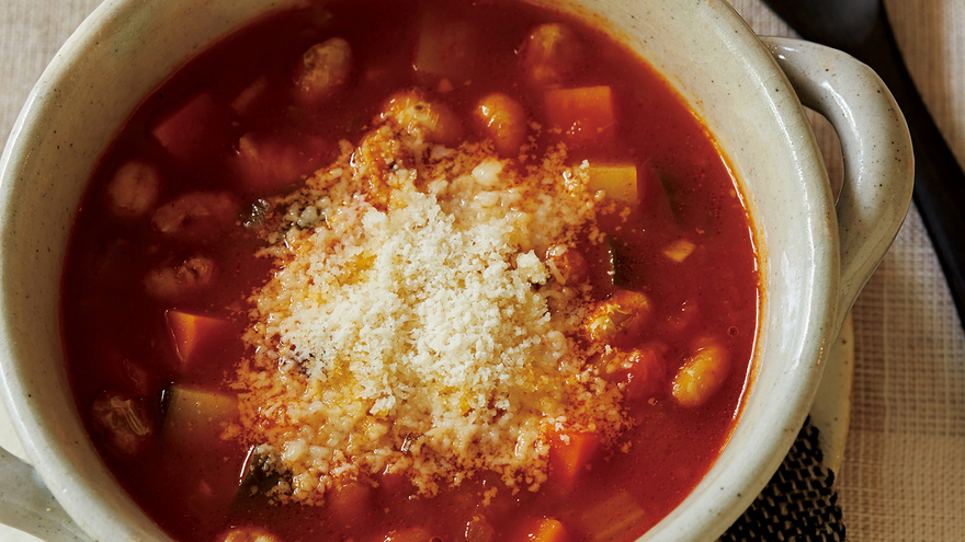 柔らかいり大豆を加えてひと混ぜし、器に盛る。粉チーズをかける。