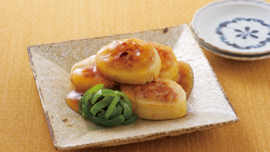 小鍋に【甘酢あん】の材料を入れて中火にかける。沸騰したら弱火にして、【水溶きかたくり粉】でとろみをつけ、たけのこの肉詰めにかける。