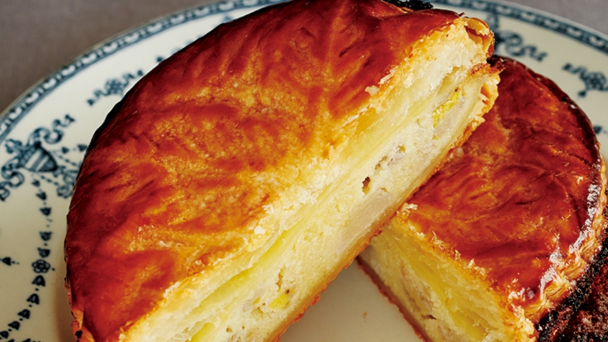 葉っぱの模様をつけたサクサクのパイの中に、バナナ入りのアーモンドクリームがぎっしり入っています。