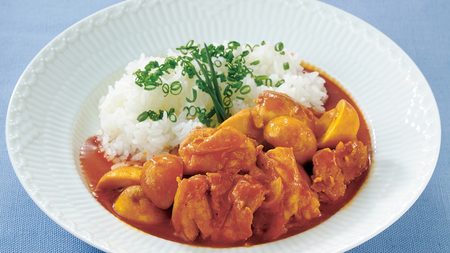 厚手の鍋にサラダ油を熱し、たまねぎを中火で炒める。少し透き通ったら、鶏肉、マッシュルームを順に加えて軽く炒める。