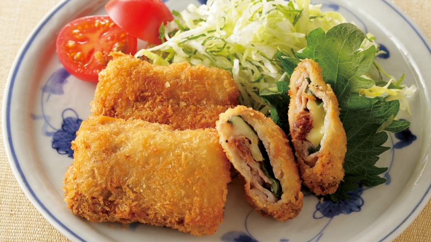 薄切り肉をつかった簡単カツ。梅かつおの風味に、チーズのコクと青じその香りがよく合います。
