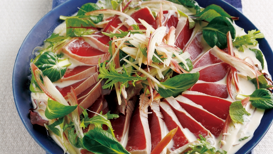 2の水けをきり、2/3量を器に広げて4を盛り、3をかけて残りの2を添える。冷蔵庫に30分間おく。まぐろにたっぷりの【ミルクごまだれ】をよくからめて食べる。