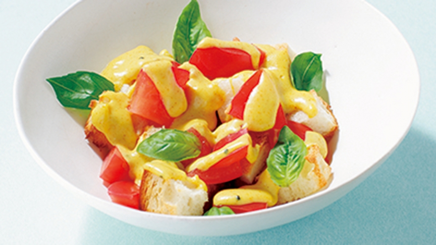 食パンは1.5cm四方に切り、オーブントースターで5分間ほどこんがりと焼き色をつける。トマトは1.5cm角に切る。