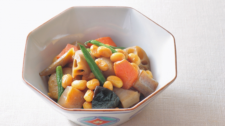 大豆に野菜から出た、うまみたっぷりの煮汁をよくからめます。大豆とほかの具材の組み合わせの妙をお楽しみください。