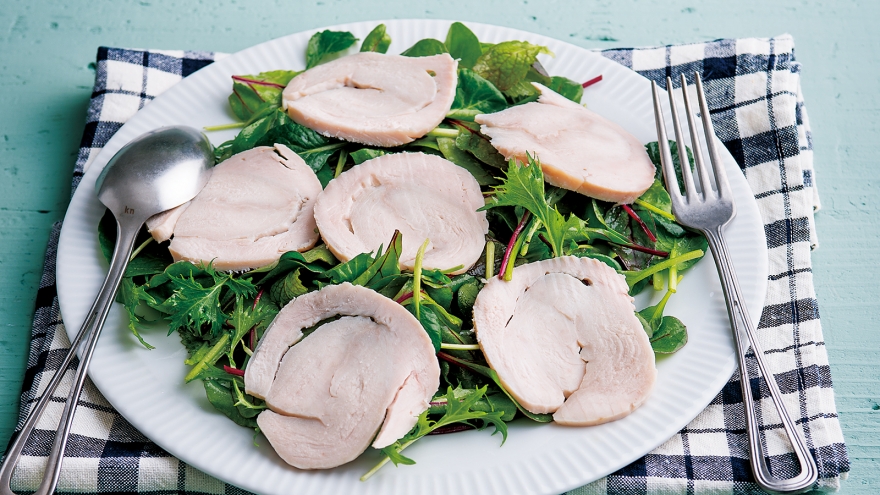とっても簡単なのに、確実に、おいしい鶏ハム。しっとりしたむね肉のうまみが、じんわりと。ベビーリーフサラダと一緒にいただくのもおすすめ。