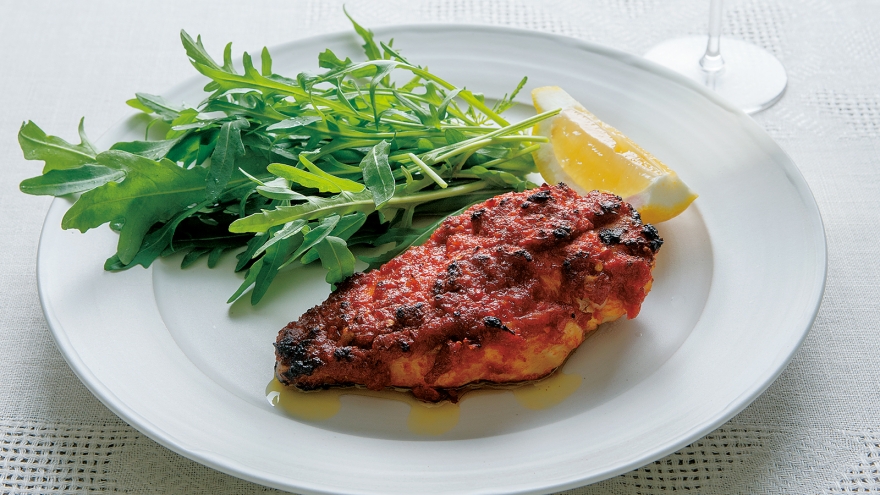 赤パプリカをペースト状にして鶏肉をマリネし、シンプルに焼いた一品です。