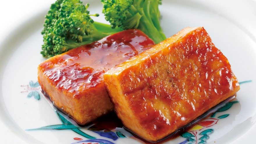同じフライパンに、酒、みりん、しょうゆ、砂糖を入れて煮立てる。汁が半量くらいになったら豆腐を加えてからめる。
