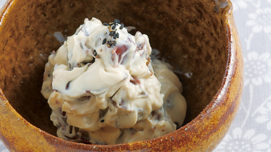 栗の渋皮煮を手で6~8等分に割り、2であえる。器に盛り、黒ごまをふる。