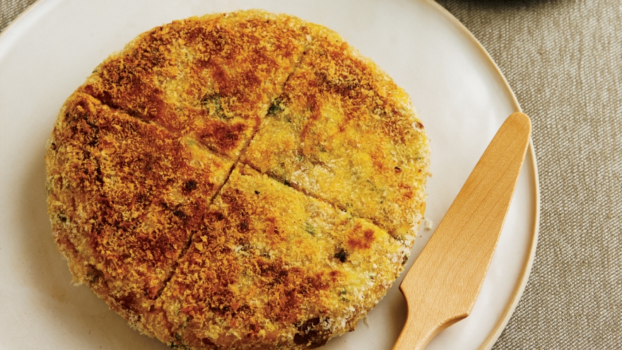 揚げるかわりに、少量の油でカリッと焼いて。タネを4等分して丸め、パン粉をつけて揚げるより、1コにつき100kcal減らせる。