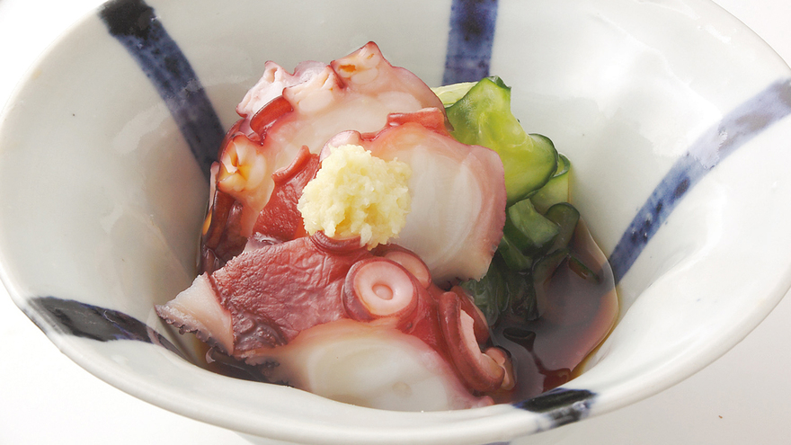 たこ、きゅうりを器に盛り、【二杯酢】をかけ、しょうがをのせる。