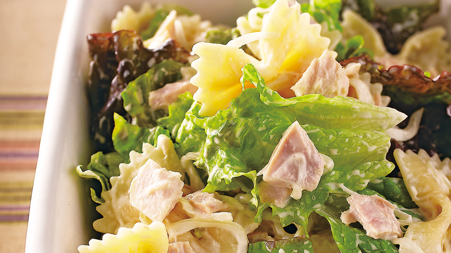 おなじみのツナサラダも、練りがらしを隠し味に加え、ちょうの形のパスタでおしゃれな一品に。