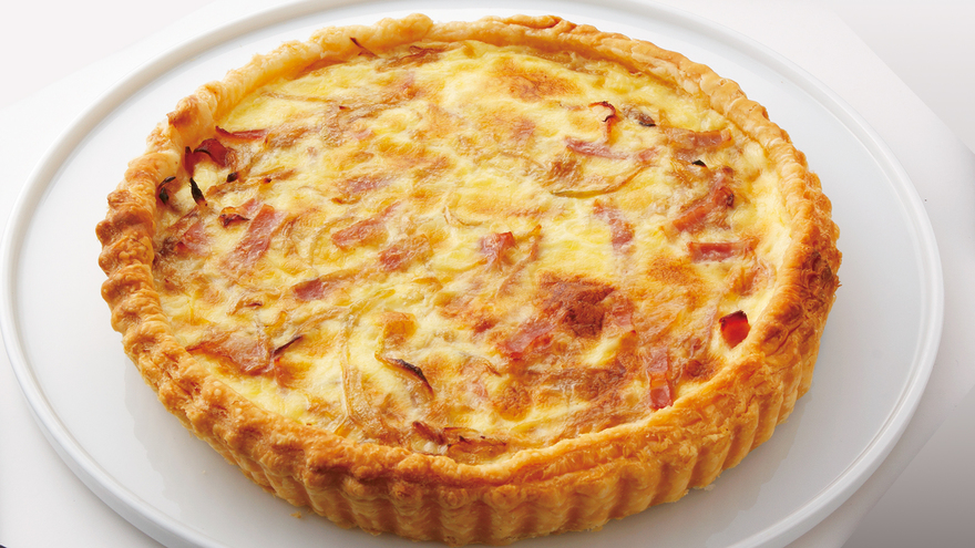ベーコンとたまねぎ入りの定番お食事キッシュ。冷凍パイシートを使ってつくります。たまねぎをしっかり炒めて甘みを出すのがコツです。
