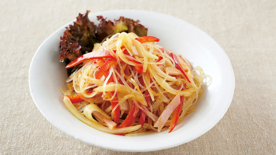 カレー粉と中濃ソースを加えたドレッシングであえた春雨サラダは、子どもも喜ぶ味です。