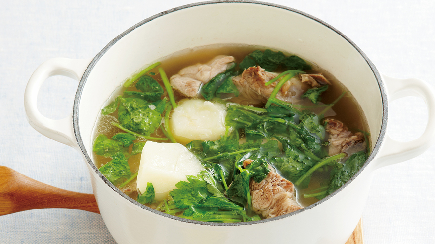 鍋にスペアリブ、たっぷりの水を入れて中火にかけ、ひと煮立ちさせてざるに上げる。水で洗って血合いなどを取り除く。じゃがいもは一口大に切る。みつばは3cm長さに切る。