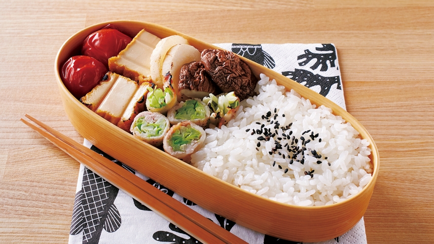 彩りのよさと味の変化が楽しめる、お弁当です。野菜をグリルで焼くと、甘みもうまみも抜群に!