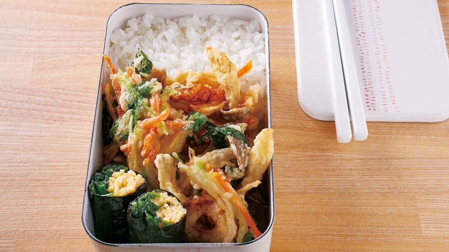 具だくさんのかき揚げは、冷蔵庫にある食材でパパッとつくれます。かき揚げの衣で残った溶き卵をサブおかずにしてムダなく使いきります。