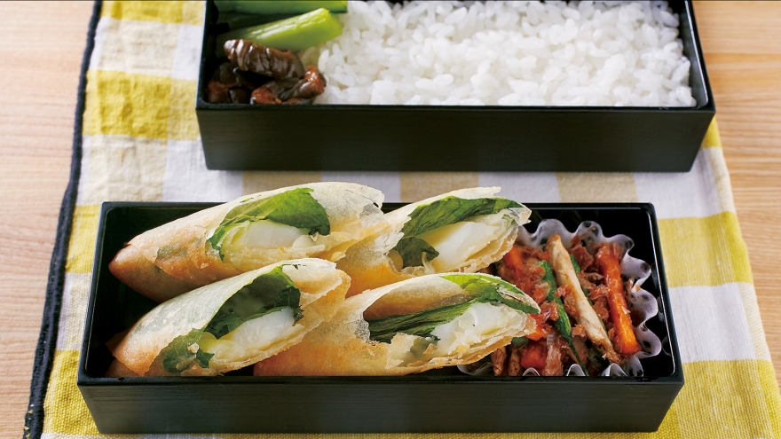 下ごしらえの必要がない具でつくる、ビギナー向きの春巻です。卵焼き器一つで主菜も副菜もつくります。