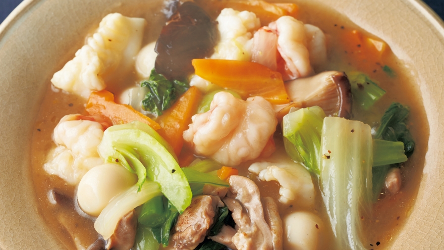 【A】を加えて味を調え、チンゲンサイ、いか、えびを加えて火を通す。火を弱めて水溶きかたくり粉を回し入れ、よく混ぜてとろみがついてきたら、強火で一度煮立たせる。最後にごま油を加え、サッと混ぜる。