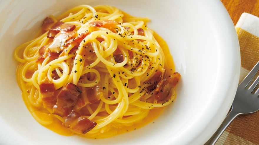 トロッとした卵ソースが人気のカルボナーラスパゲッティ。混ぜるタイミングが口当たりなめらかにつくるコツ。黒こしょうでキリリと引締めて。