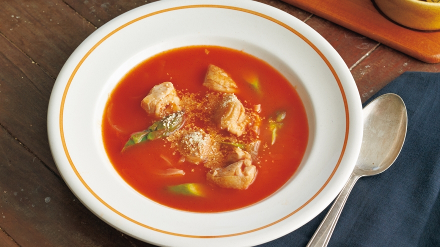 しっかり焼きつけた鶏もも肉から出るうまみが、だしがわりです。トマトジュースと水だけでもおいしく仕上がります。