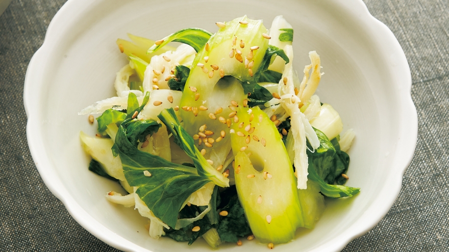 セロリは葉と茎に分けて切り方を変え、異なる食感を楽しむ。茎は斜め切りにして断面を広くし、葉はザク切りに。
