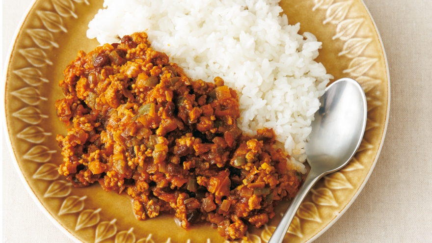 ひき肉にカレー粉をまぶしてから炒めて、スパイシーさをアップ。野菜ジュースで煮るので、本格的なカレーが手軽につくれます。