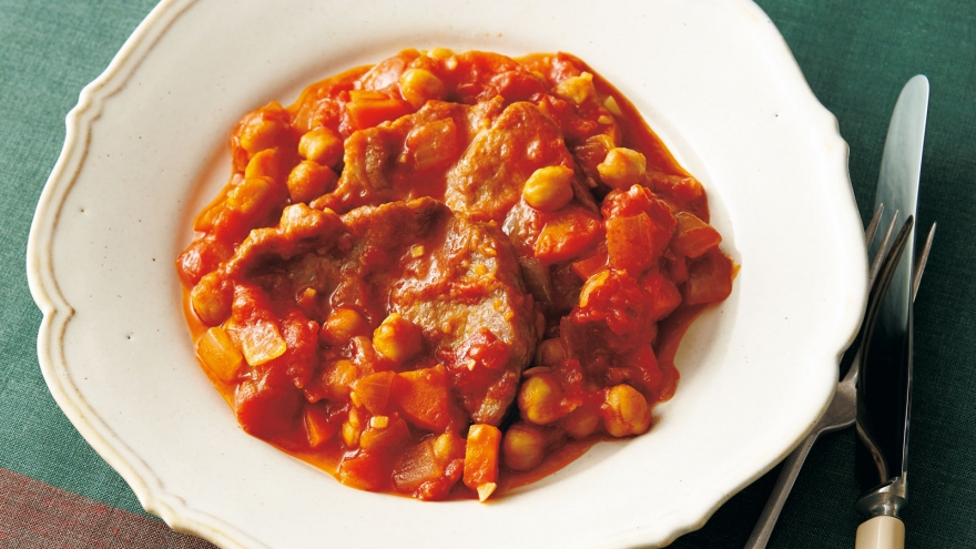 豚カツやソテー用の厚めの豚肉に小麦粉をまぶして、うまみを閉じ込めます。ひよこ豆のホクッとした食感も魅力。