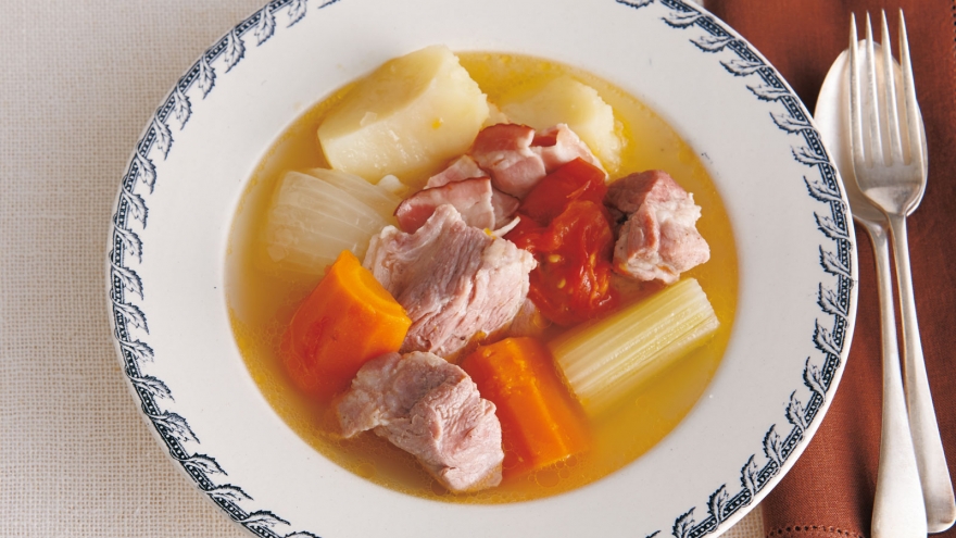 豚の塊肉と野菜を大きめに切ってじっくりと煮込みます。ポトフは時間がおいしくしてくれる料理です。