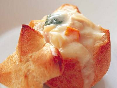 いつものクリームシチューも、くりぬいたパンに1人分ずつ入れると、おもてなしの一品に。