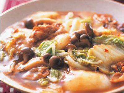 中華鍋をよく熱してサラダ油を入れ、1の豚肉を強火で炒める。肉の色が変わったら白菜の芯を加え、芯の縁が透き通ってきたら、白菜の葉、しめじの順に加えて炒める。