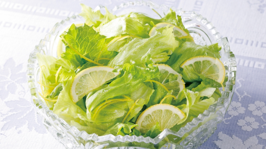 レタスは葉をはがし、食べやすい大きさにちぎる。ボウルにたっぷりの氷水を入れてレタスを20分間ほどつけ、パリッとさせてざるに上げ、水けをよくきる。器に盛り、食べるときまで冷蔵庫で十分に冷やしておく。
