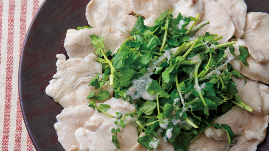 たっぷりの熱湯に1%の塩(1リットルに対して小さじ2)を入れ、4の肉を数回に分けてサッとゆでる。湯をきって器に並べ、クレソンをちぎって添え、2のソースを適量かける。