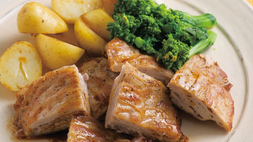 脂身の多いほうを下にすれば、自然に脂が出てきて肉はこんがり。じゃがいもも、その肉の脂で焼くから余分な油も使わないし、後片づけも簡単。