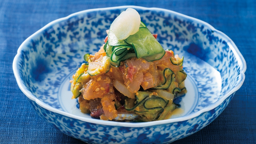 らっきょうときゅうりはすべてをあえずに少しとりおき、器に盛ったあとでトッピングに使うときれいに仕上がる。
