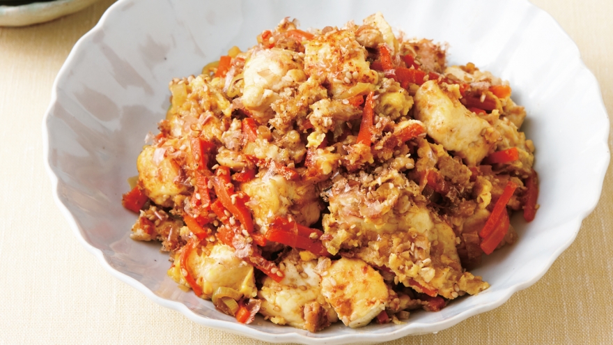 豆腐を炒めて水分をとばし、焼き目をつけて香ばしく仕上げます。ひき肉のうまみ、にんじんの食感、ねぎの香りに卵のコクも合わせて、盛りだくさんの味を楽しみます。削り節とすりごまでまとめて、さらにおいしくにぎやかに!