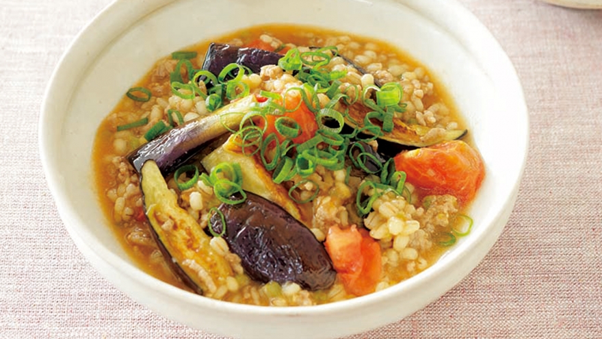 肉となすのうまみをもち麦がキャッチ!いつもの半量のひき肉であんがつくれて、かさ増し効果が絶大。