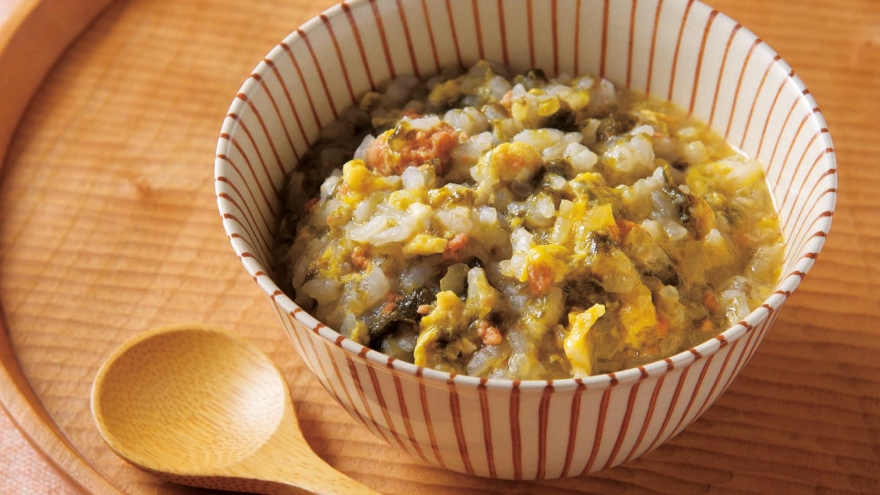 おにぎりは3つに割って鍋に入れ、だしを加えて中火にかける。ほぐしながら好みの柔らかさになるまで煮る。