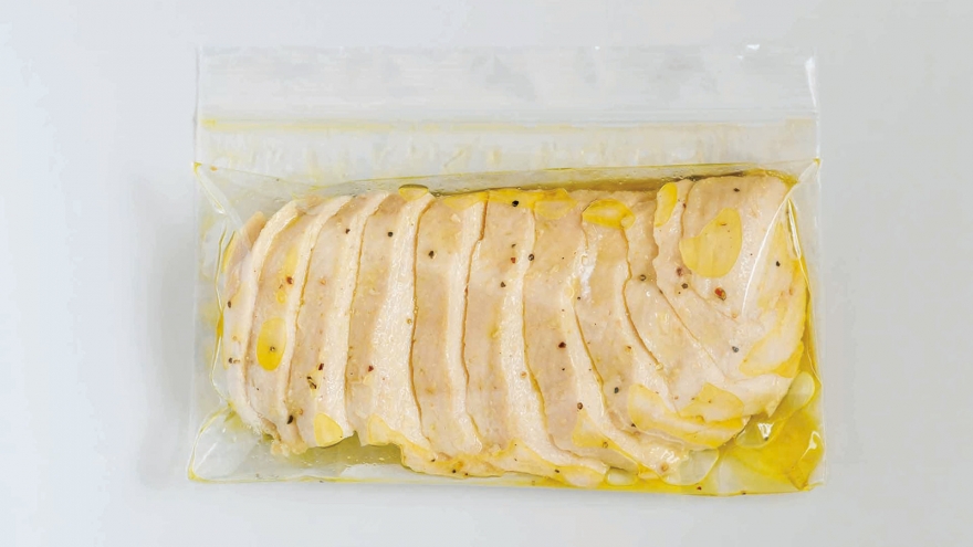 ジッパー付き保存袋に、オリーブ油、顆粒スープの素、おろしにんにく、レモン汁、黒こしょうを入れて混ぜる。鶏肉を加え、袋の上からもんで全体をなじませる。