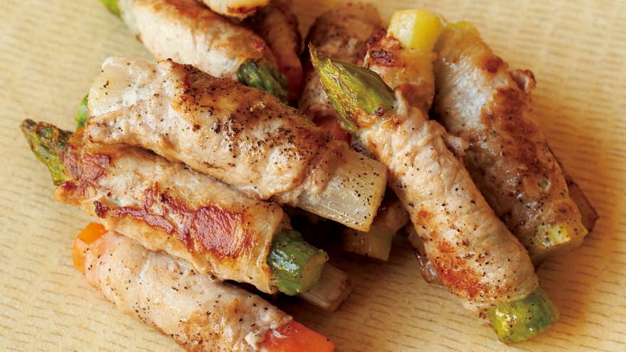 3の野菜1本ずつに豚肉をクルクルと巻く。巻いたらキュッと握り、巻き終わりを密着させる。